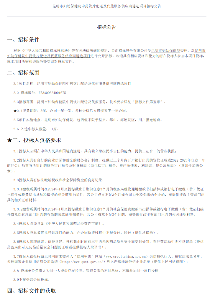 【昆明市妇幼保健院】云南省昆明市妇幼保健院中药饮片配送及代煎服务供应商遴选项目招标公告