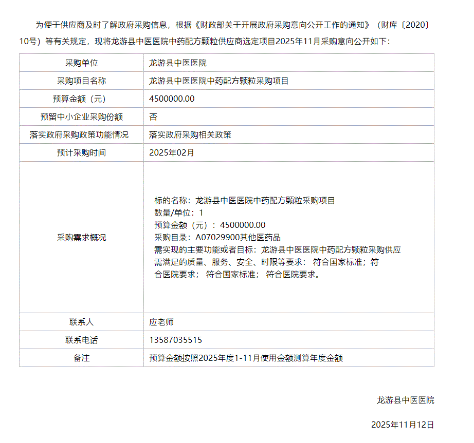 【衢州市龙游县中医医院】浙江省衢州市龙游县中医医院中药配方颗粒供应商选定项目2025年11月政府采购意向
