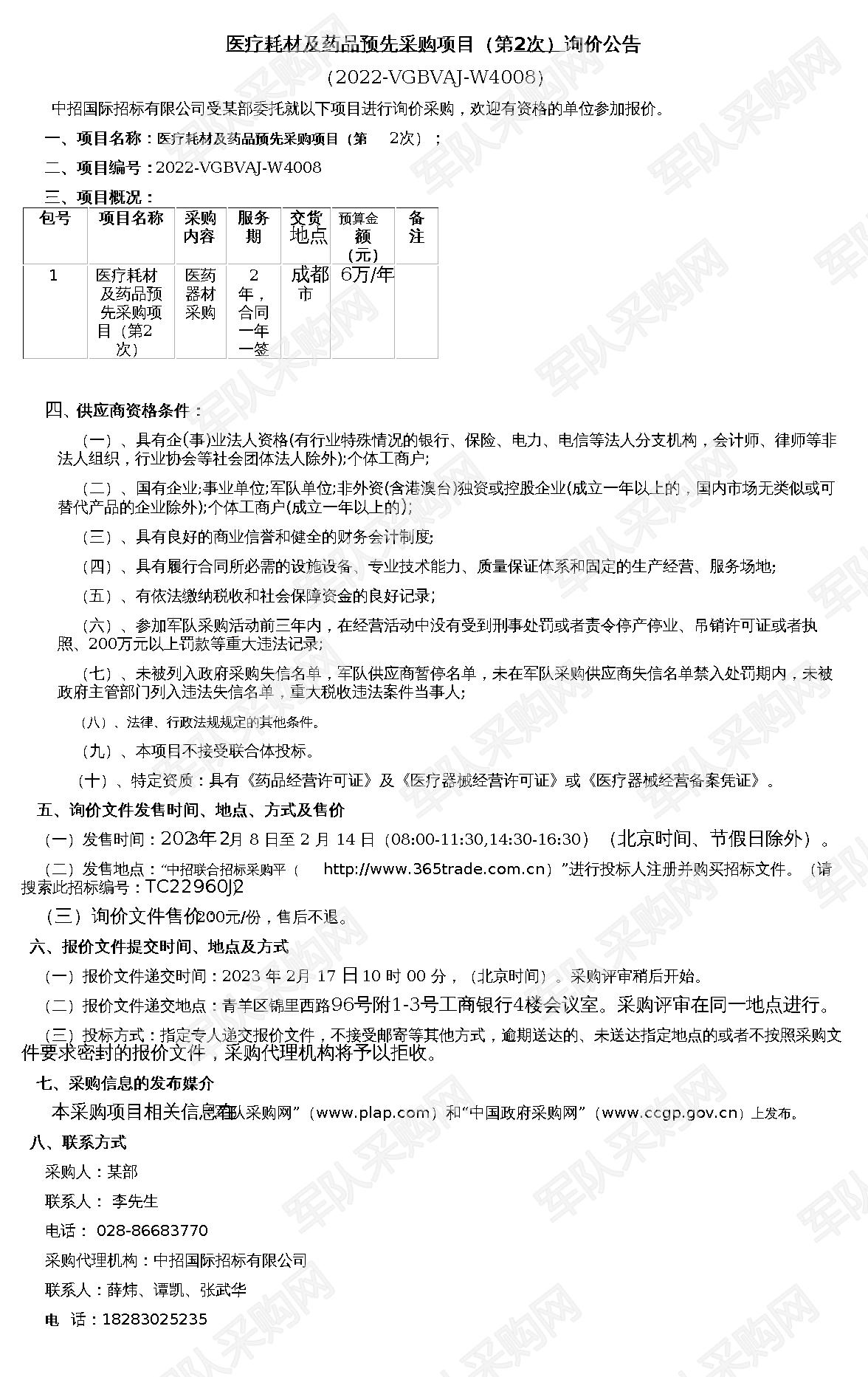 【军队采购】军队采购网医疗耗材及药品预先采购项目(第2次)询价公告 (2022-VGBVAJ-W4008)