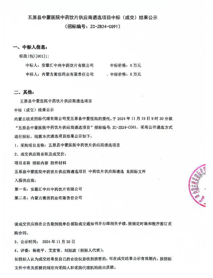 【巴彦淖尔市五原县中蒙医院】内蒙古自治区巴彦淖尔市五原县中蒙医院中药饮片供应商遴选项目中标(成交)结果公示
