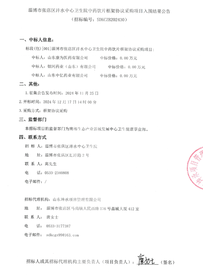 【淄博市张店区沣水中心卫生院】山东省淄博市张店区沣水中心卫生院中药饮片框架协议采购项目入围结果公告