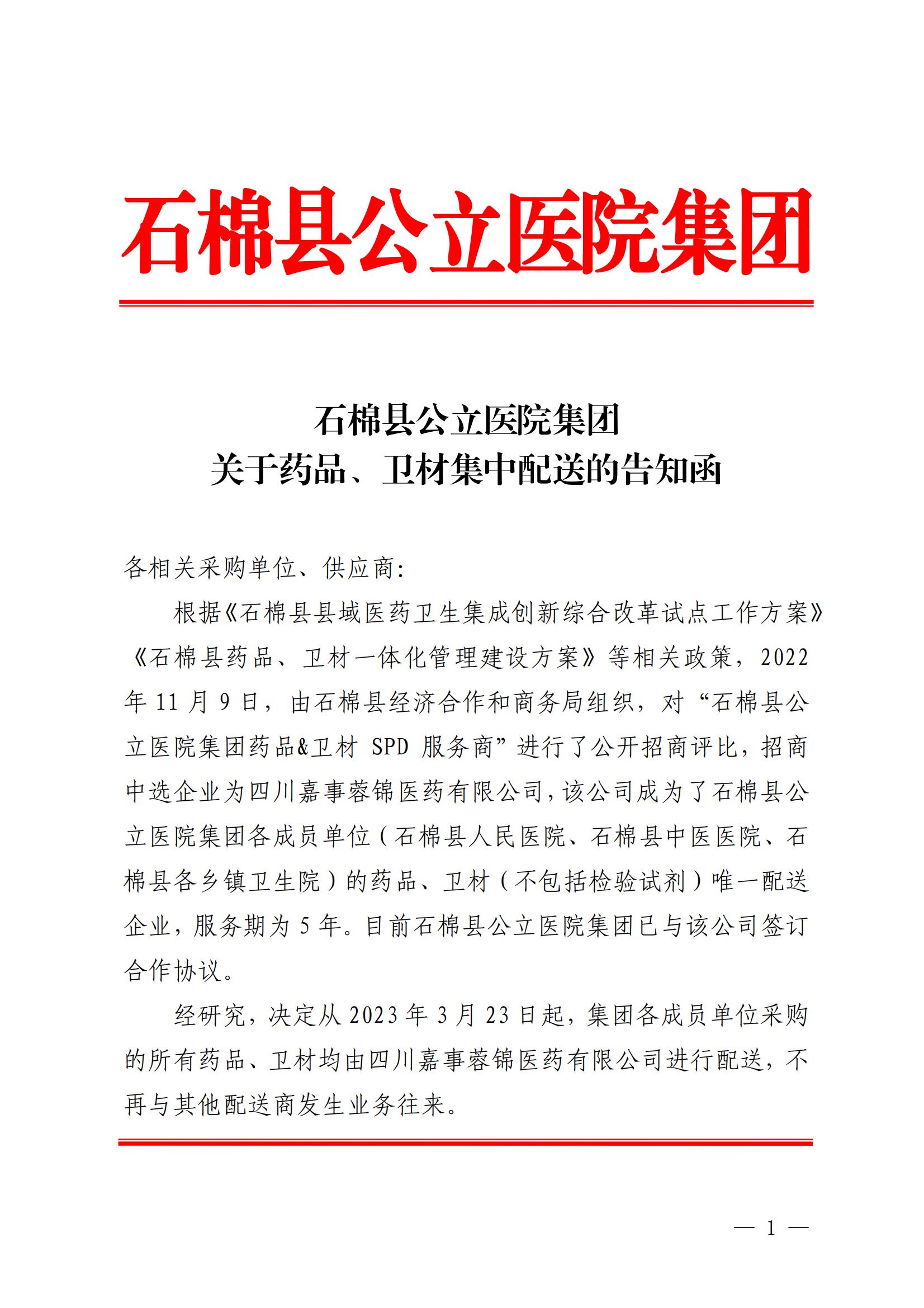 【雅安市石棉县人民医院】四川省雅安市石棉县人民医院关于药品、卫材集中配送的告知函