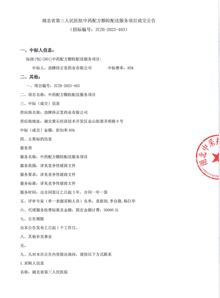 【湖北省第三人民医院】湖北省第三人民医院中药配方颗粒配送服务项目成交公告