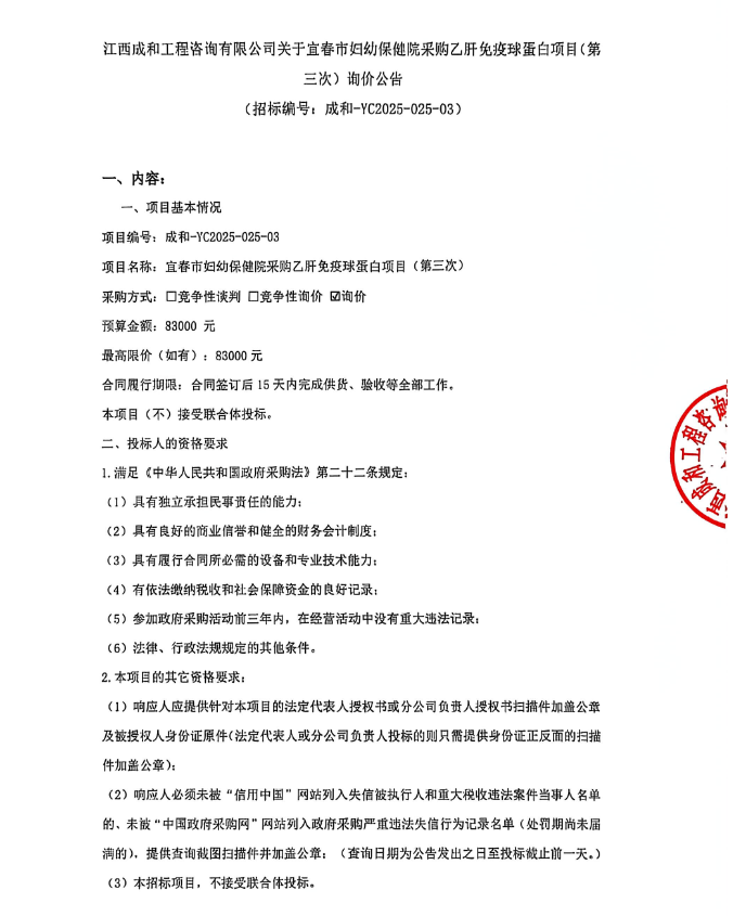 【宜春市妇幼保健院】江西成和工程咨询有限公司关于宜春市妇幼保健院采购乙肝免疫球蛋白项目(第三次)询价公告