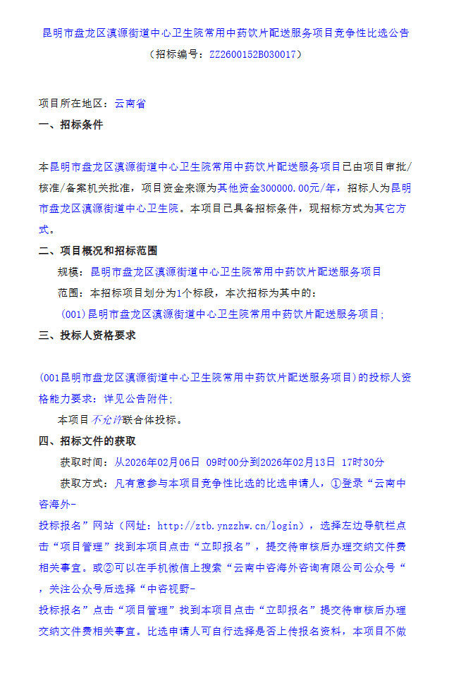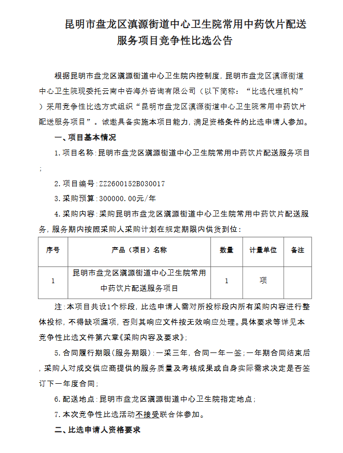 【昆明市盘龙区滇源街道中心卫生院】云南省昆明市盘龙区滇源街道中心卫生院常用中药饮片配送服务项目竞争性比选公告