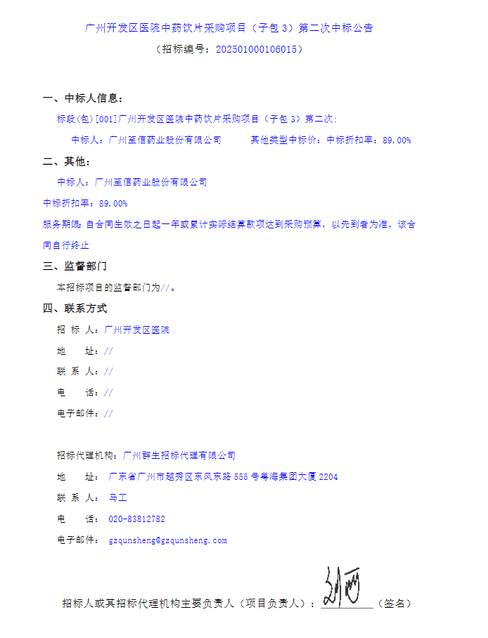 【广州开发区医院】广东省广州开发区医院中药饮片采购项目(子包3)第二次中标公告