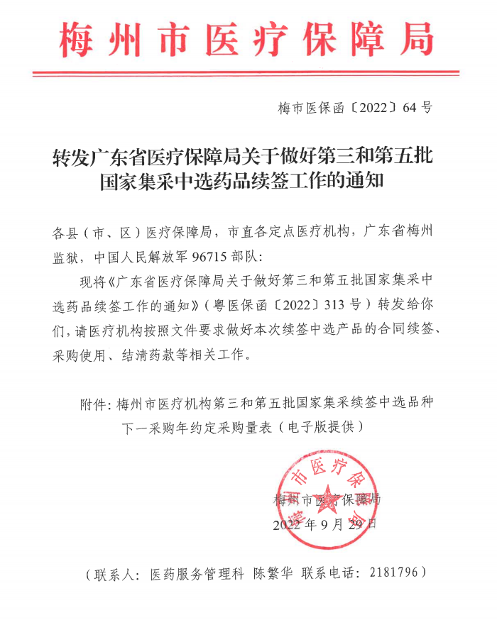 【梅州】梅州市转发广东省医疗保障局关于做好第三和第五批国家集采中选药品续签工作的通知