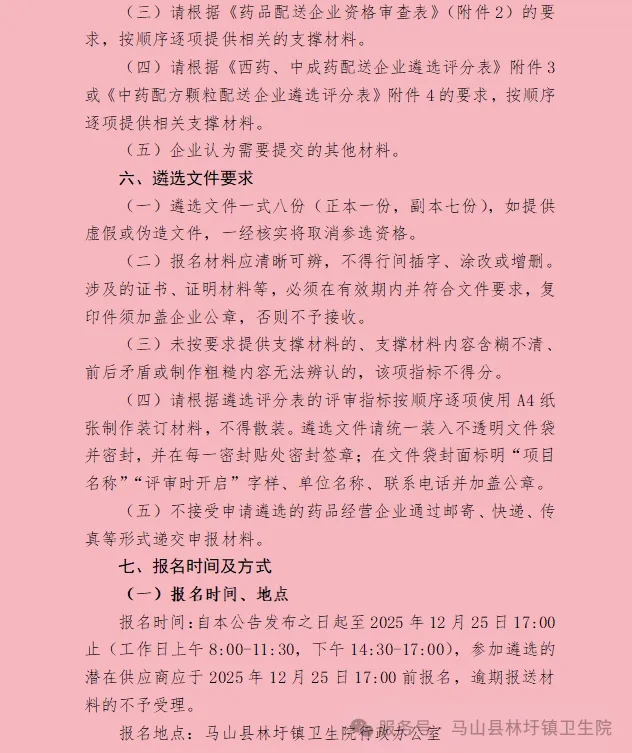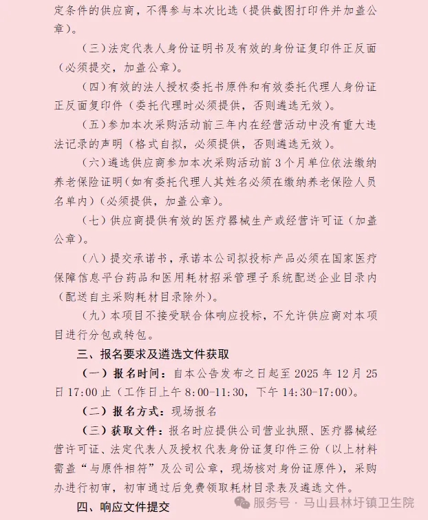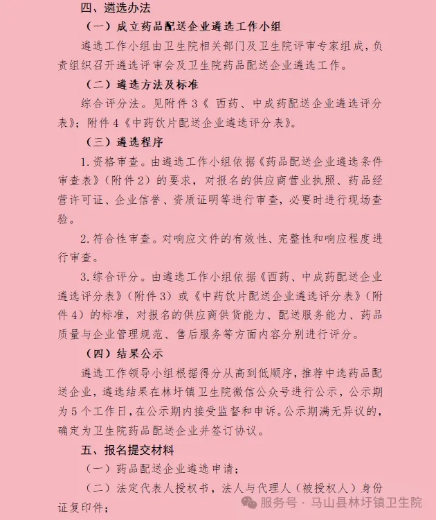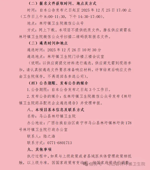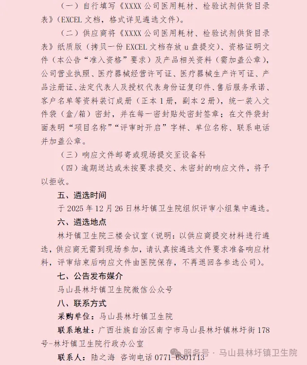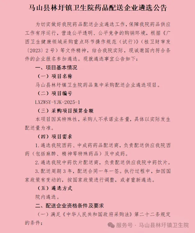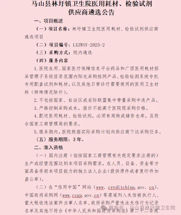 【南宁市马山县林圩镇卫生院】广西壮族自治区南宁市马山县林圩镇卫生院药品、医用耗材(含试剂)供应商遴选公告