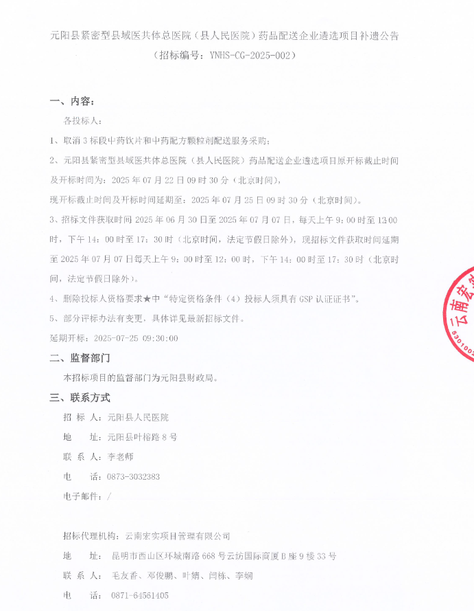 【红河哈尼族彝族自治州元阳县人民医院】云南省红河哈尼族彝族自治州元阳县紧密型县域医共体总医院(县人民医院)药品配送企业遴选项目补遗公告