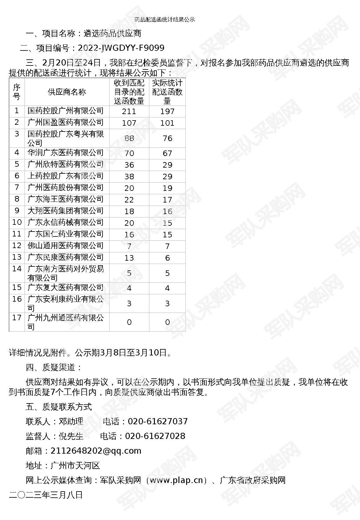 【军队采购】军队采购网药品配送函统计结果公示(2022-JWGDYY-F9099)(20230308)