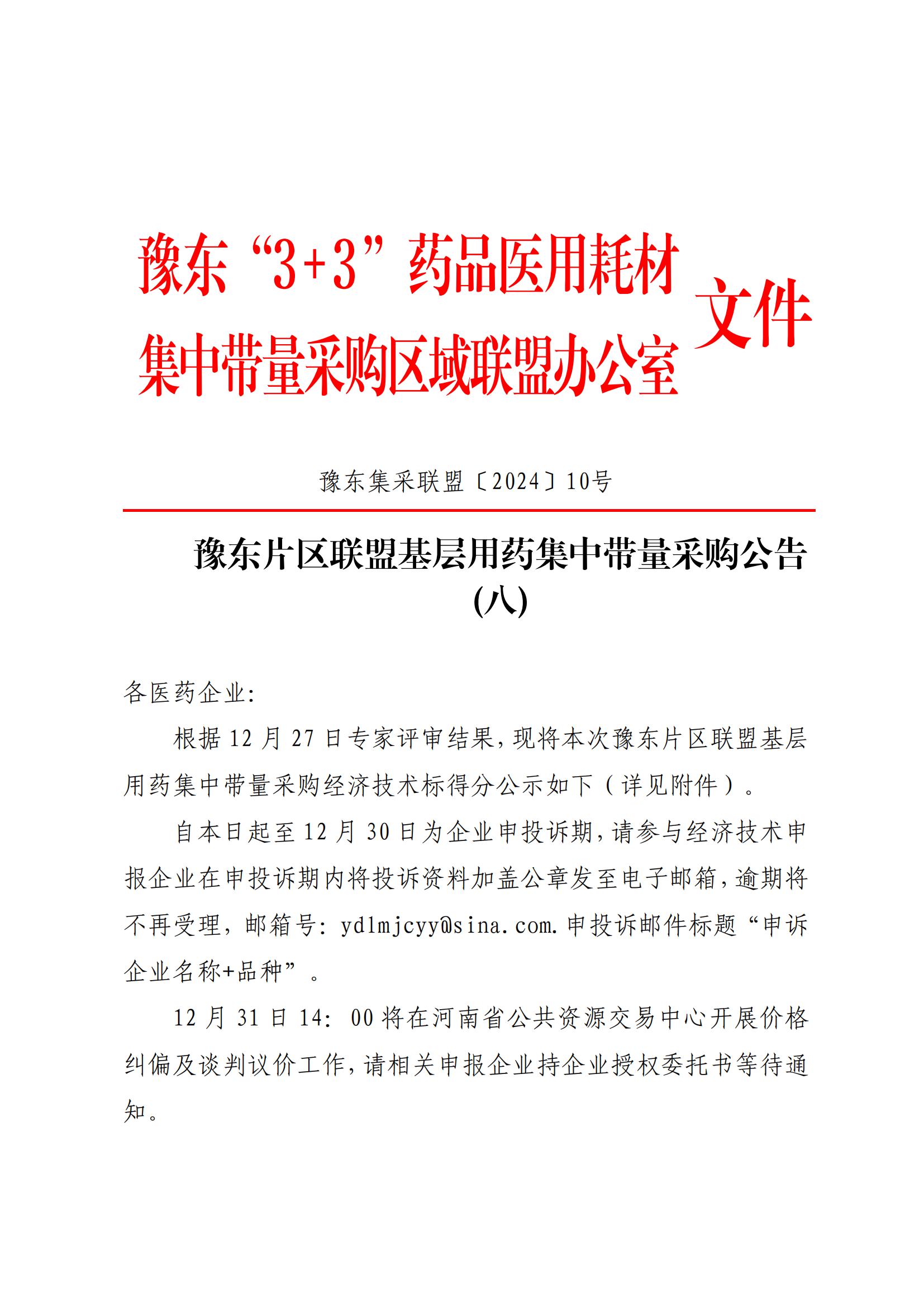 各医药企业: 根据12月27日专家评审结果,现将本次豫东片区联盟基层用药集中带量采购经济技术标得分公示如下(详见附件)。 自本日起至12月30日为企业申投诉期,请参与经济技术申报企业在申投诉期内将投诉资料加盖公章发至电子邮箱,逾期将不再受理,邮箱号:yd1mjcyyasina.com.申投诉邮件标题“申诉企业名称+品种”。 12月31日14:00将在河南省公共资源交易中心开展价格纠偏及谈判议价工作,请相关申报企业持企业授权委托书等待通知。