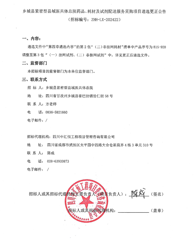 【甘孜藏族自治州乡城县紧密型县域医共体总院】四川省甘孜藏族自治州乡城县紧密型县域医共体总院药品、耗材及试剂配送服务采购项目遴选更正公告