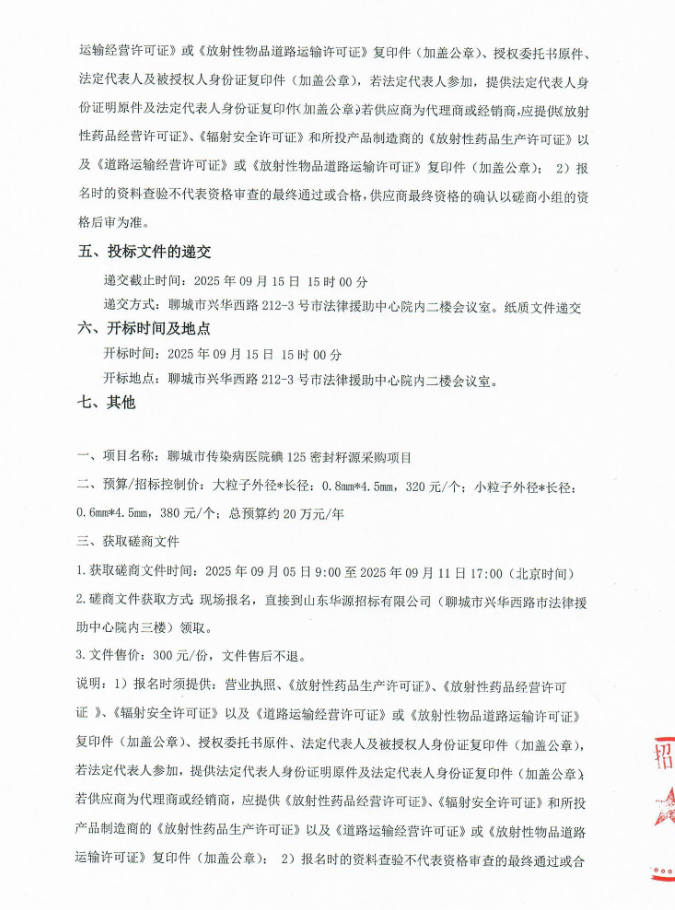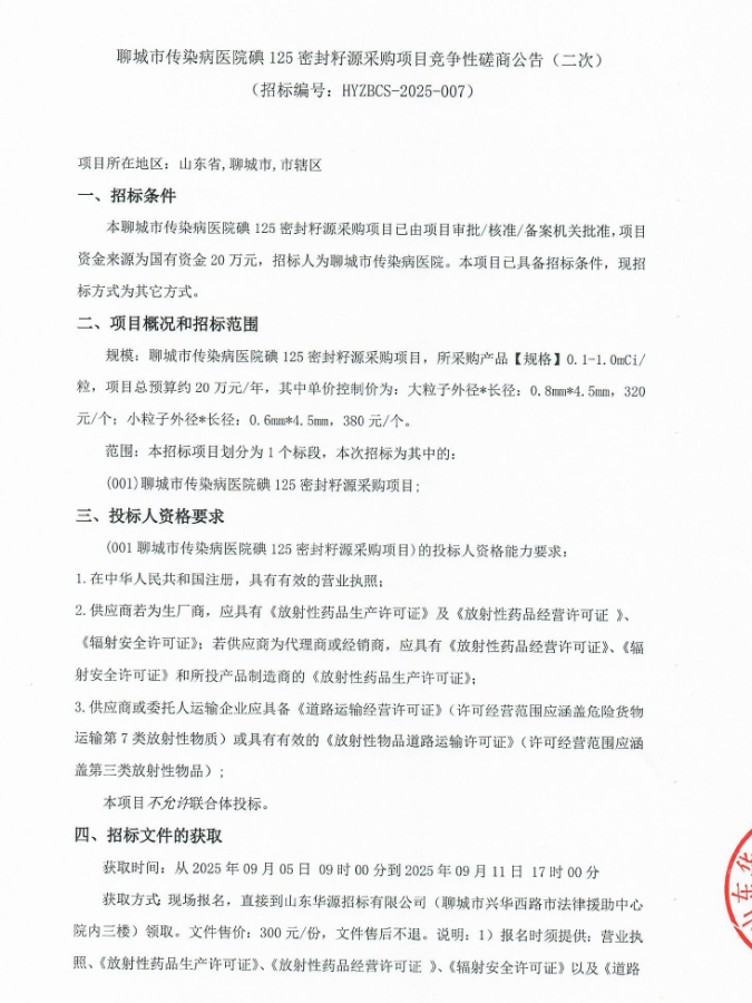 【聊城市传染病医院】山东省聊城市传染病医院碘125密封籽源采购项目竞争性磋商公告(二次)