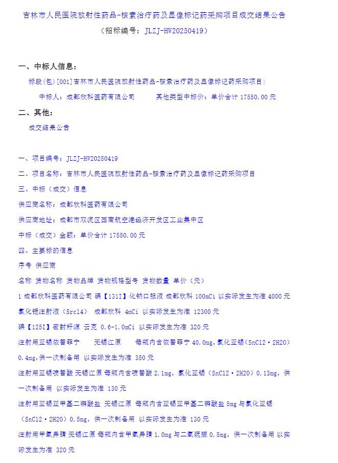 【吉林市人民医院】吉林省吉林市人民医院放射性药品-核素治疗药及显像标记药采购项目成交结果公告