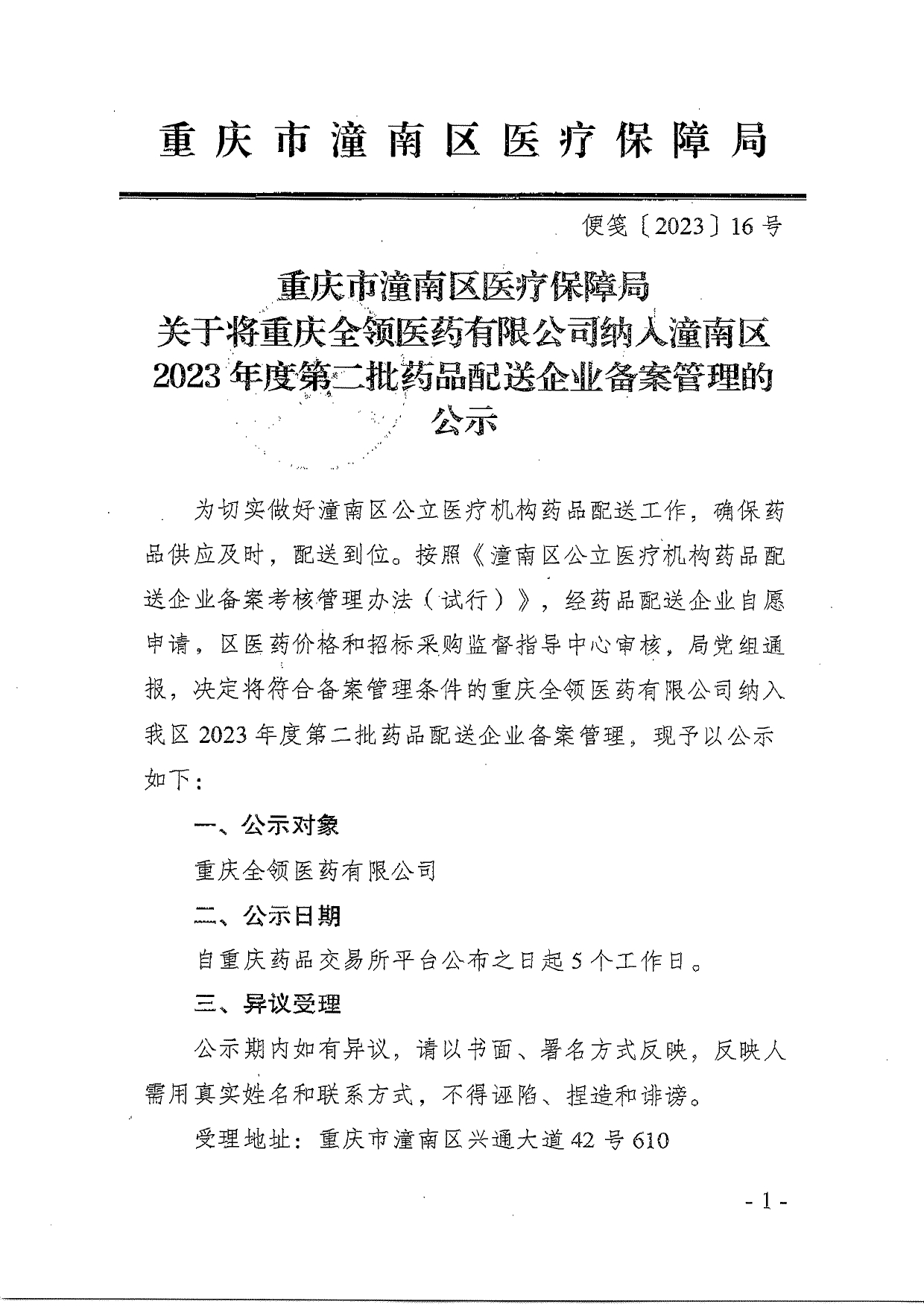 为切实做好潼南区公立医疗机构药品配送工作,确保药品供应及时,配送到位。按照《潼南区公立医疗机构药品配送企业备案考核管理办法(试行)》,经药品配送企业自愿申请,区医药价格和招标采购监督指导中心审核,局党组通报,决定将符合备案管理条件的重庆全领医药有限公司纳入我区2023年度第二批药品配送企业备案管理,现予以公示