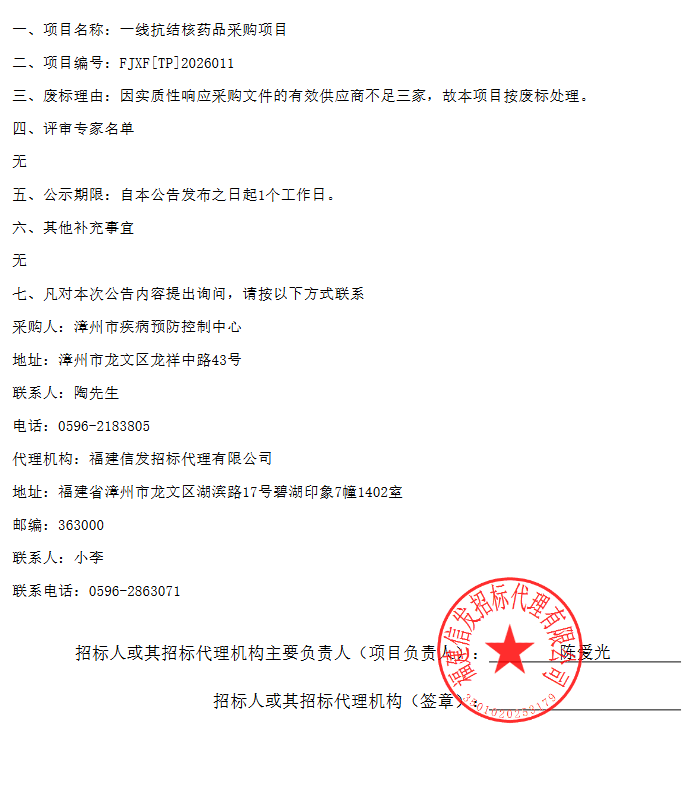 【漳州市疾病预防控制中心】福建省漳州市疾病预防控制中心一线抗结核药品采购项目废标公告