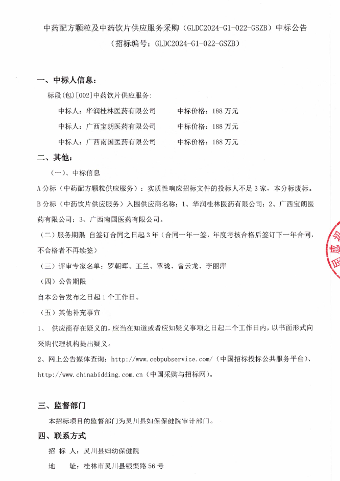 【桂林市灵川县妇幼保健院】广西壮族自治区桂林市灵川县妇幼保健院中药配方颗粒及中药饮片供应服务采购(GLDC2024-G1-022-GSZB)中标公告