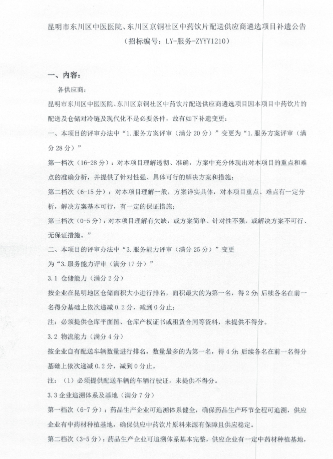 【昆明市东川区中医医院】云南省昆明市东川区中医医院、东川区京铜社区中药饮片配送供应商遴选项目补遗公告