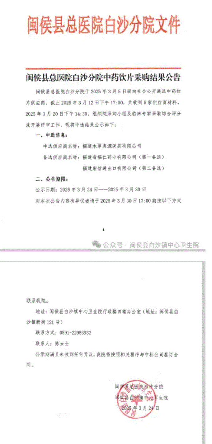 【福州市闽侯县总医院】福建省福州市闽侯县总医院白沙分院中药饮片采购结果公告