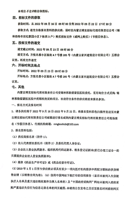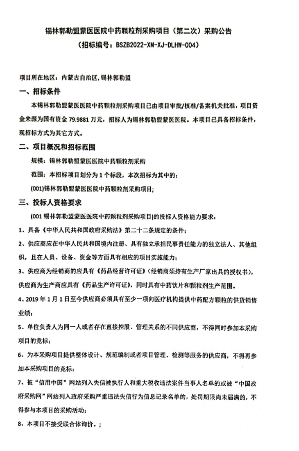 【锡林郭勒盟蒙医医院】锡林郭勒盟蒙医医院中药颗粒剂采购(第二次)采购公告
