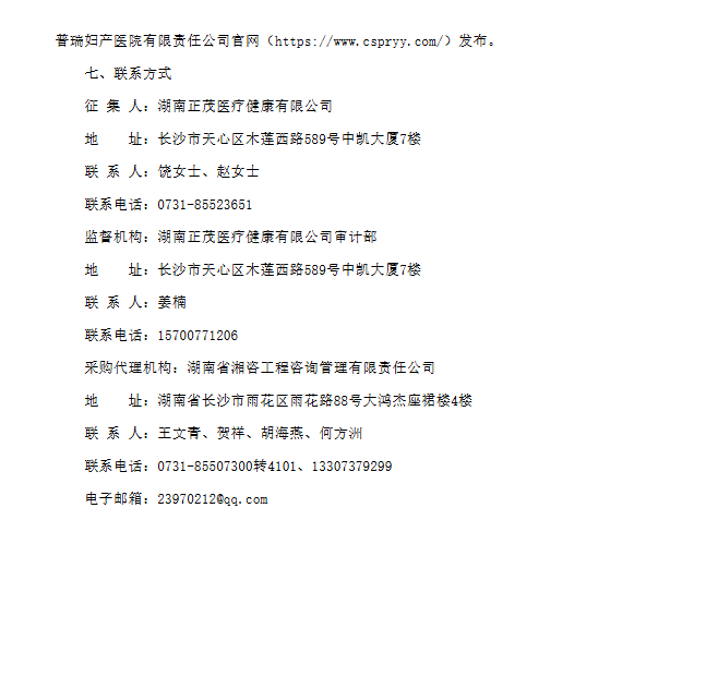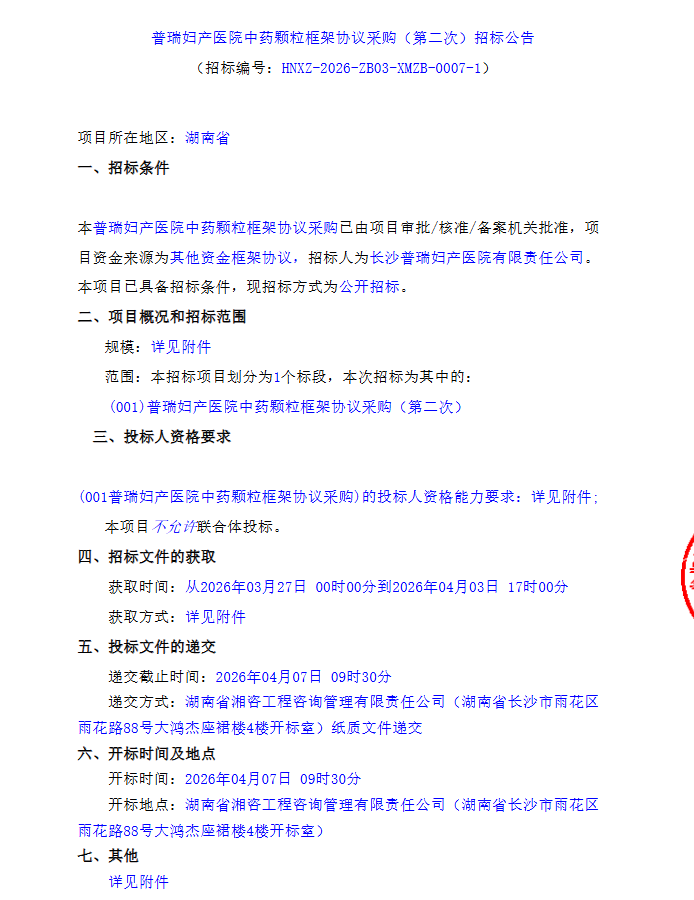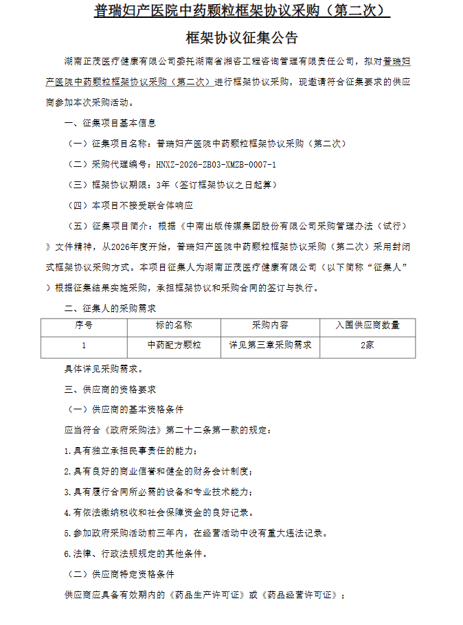 【长沙市普瑞妇产医院】湖南省普瑞妇产医院中药颗粒框架协议采购(第二次)招标公告