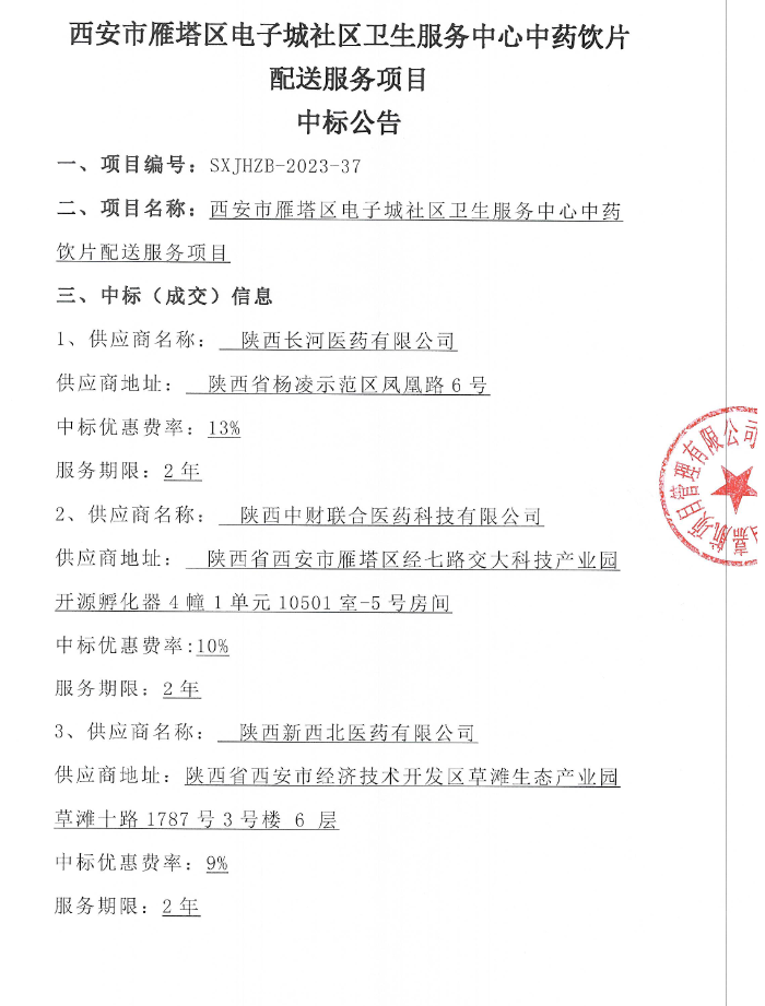 【西安市雁塔区电子城社区卫生服务中心】陕西省西安市雁塔区电子城社区卫生服务中心中药饮片配送服务项目中标公告