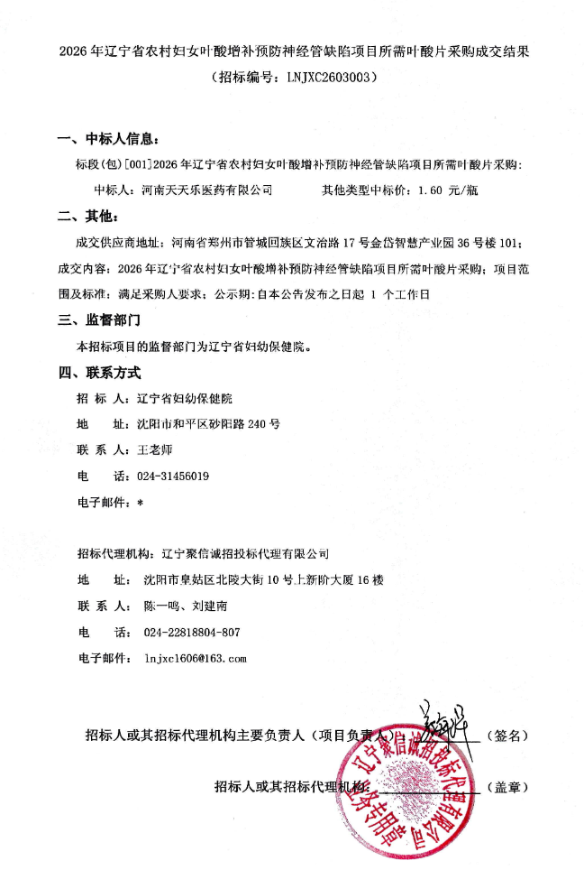 【辽宁省妇幼保健院】2026年辽宁省农村妇女叶酸增补预防神经管缺陷项目所需叶酸片采购成交结果
