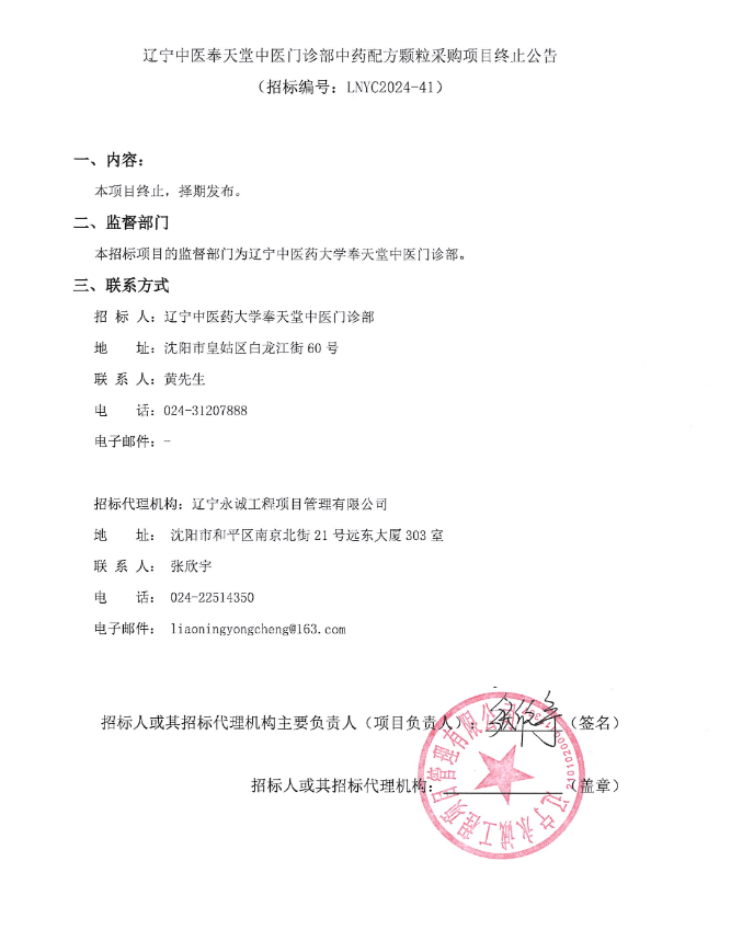 【辽宁中医奉天堂中医门诊部】辽宁中医奉天堂中医门诊部中药配方颗粒采购项目终止公告