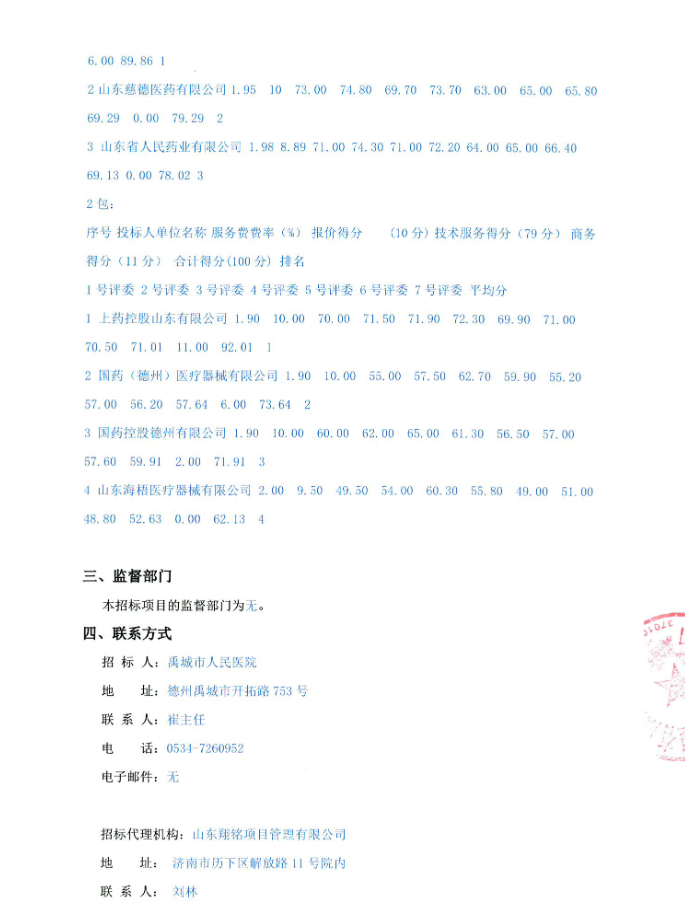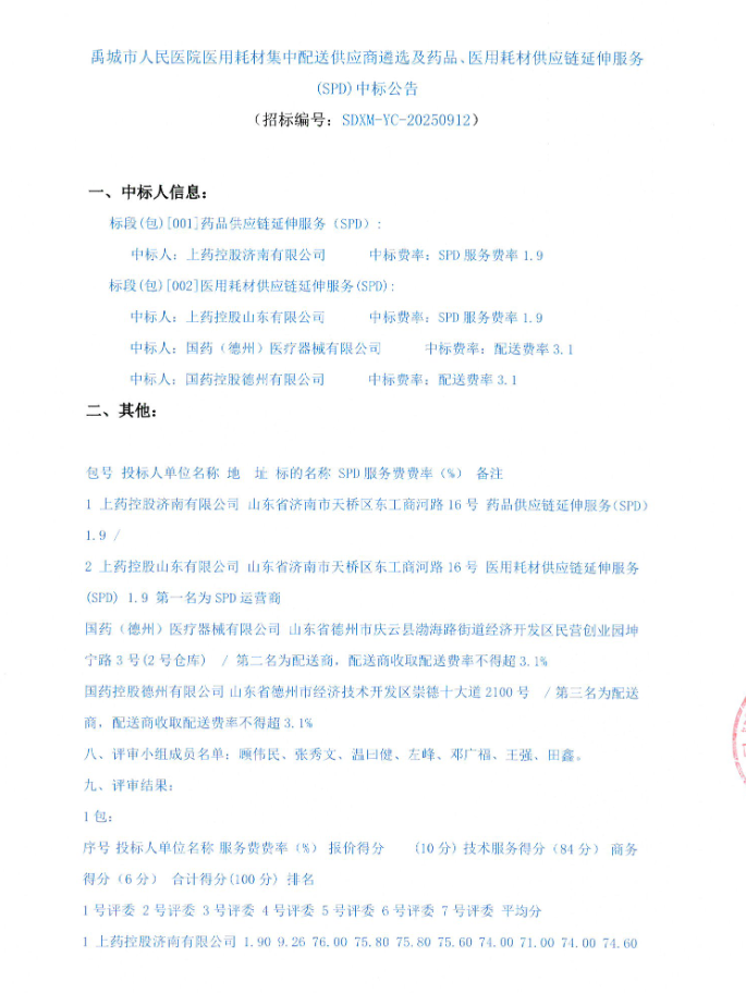 【德州市禹城市人民医院】山东省禹城市人民医院医用耗材集中配送供应商遴选及药品、医用耗材供应链延伸服务(SPD)中标公告