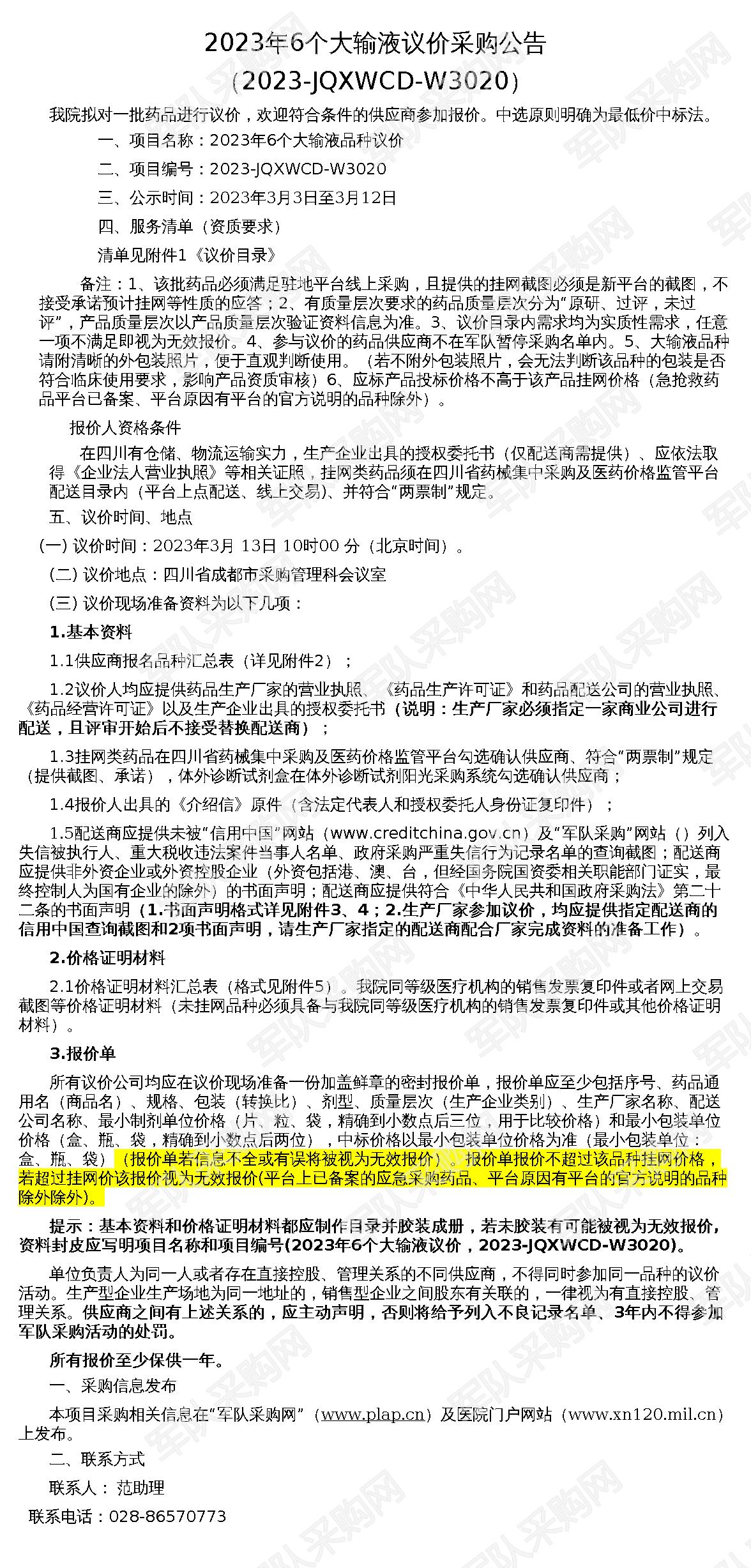 【军队采购】军队采购网2023年6个大输液议价采购公告(2023-JQXWCD-W3020)