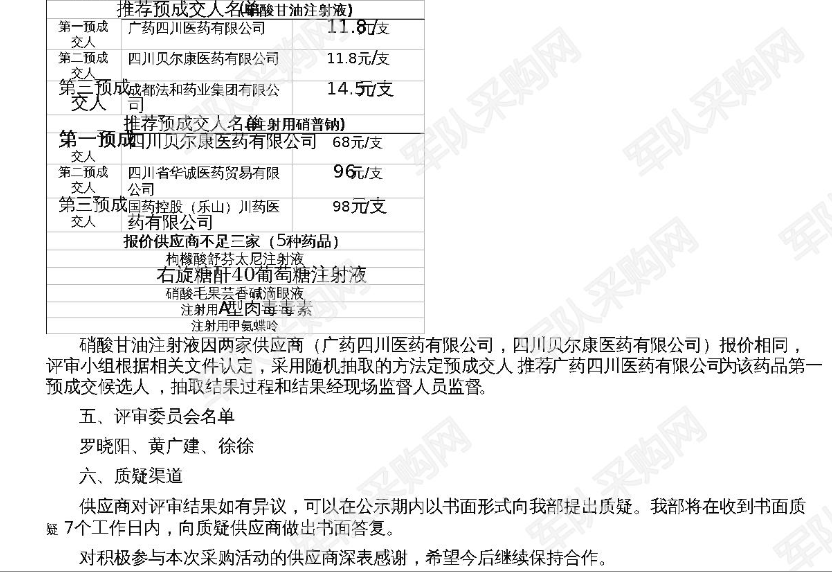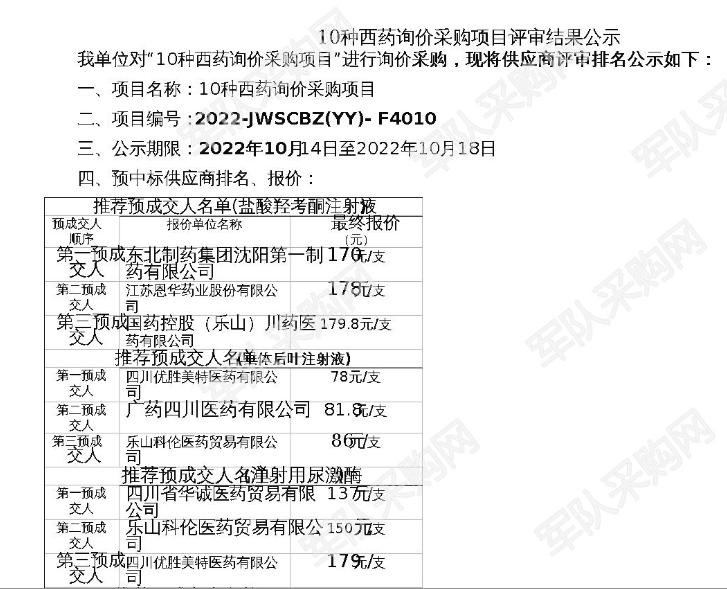 【军队采购网】10种西药询价采购项目评审结果公示(2022-JWSCBZ(YY)-F4010)