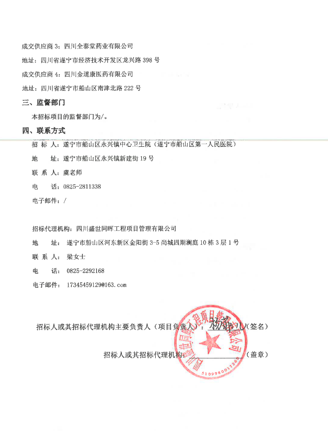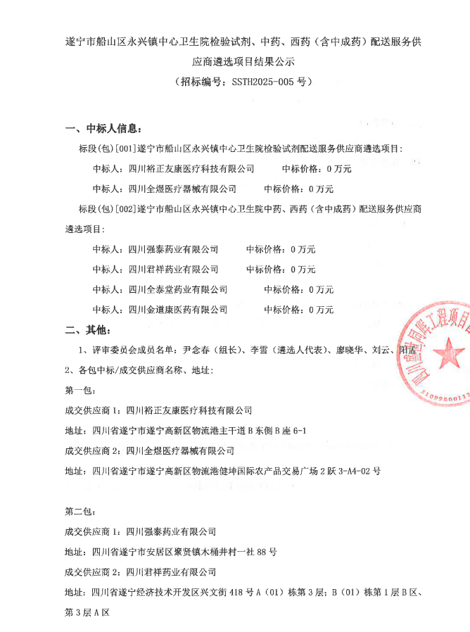【遂宁市船山区永兴镇中心卫生院】四川省遂宁市船山区永兴镇中心卫生院检验试剂、中药、西药(含中成药)配送服务供应商遴选项目结果公示