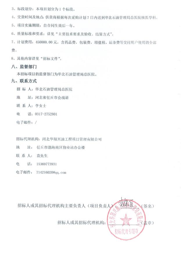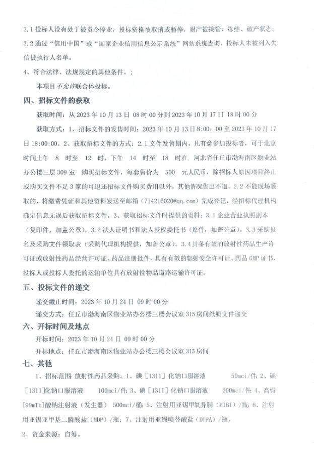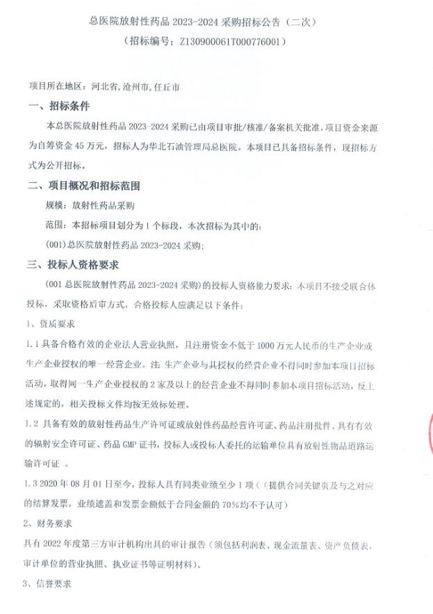 【沧州市任丘市总医院】河北省沧州市任丘市总医院放射性药品2023-2024采购招标公告(二次)