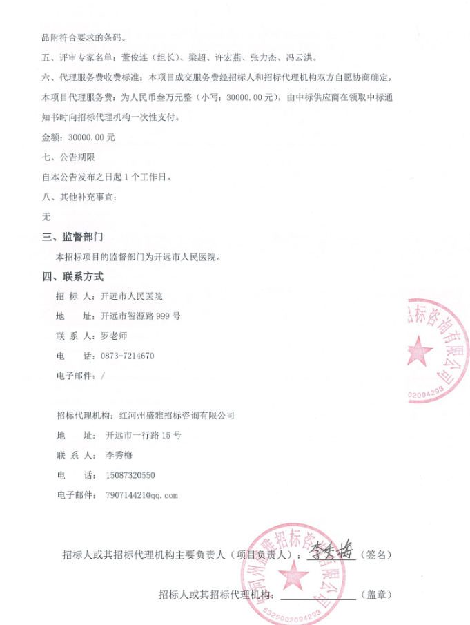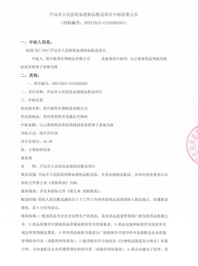 【红河哈尼族彝族自治州开远市人民医院】云南省开远市人民医院血液制品配送项目中标结果公告