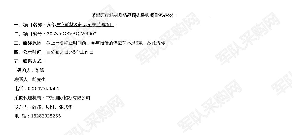 【军队采购】军队采购网某部医疗耗材及药品预先采购项目(2023-VGBVAQ-W4003)(20230428)