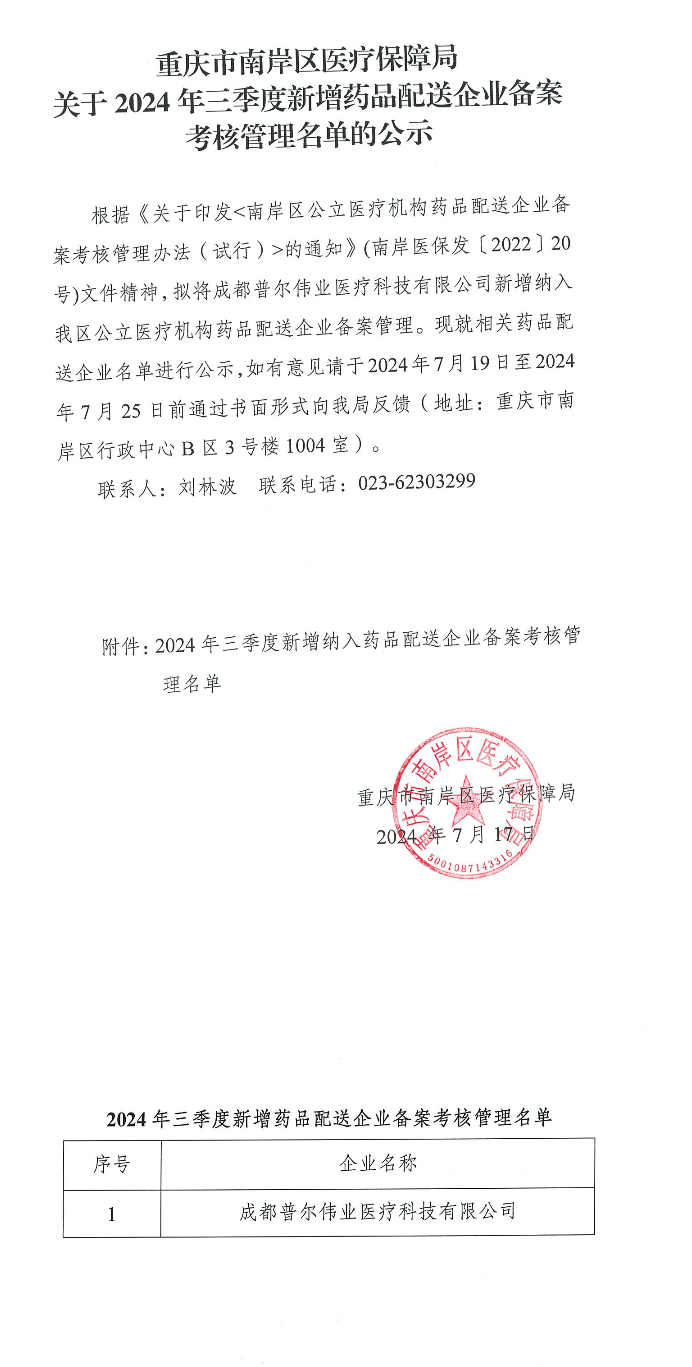 【重庆】重庆市南岸区医疗保障局关于2024年三季度新增药品配送企业备案考核管理名单的公示