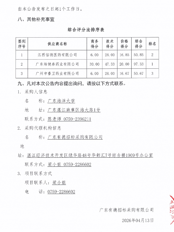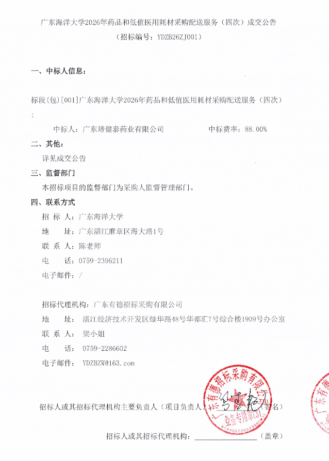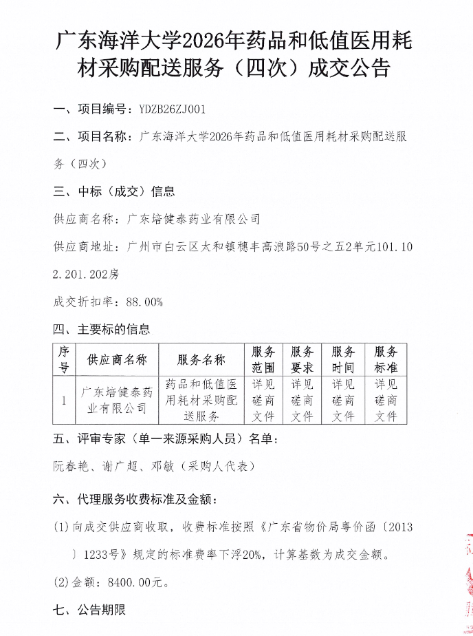 【广东海洋大学】广东海洋大学2026年药品和低值医用耗材采购配送服务(四次)成交公告