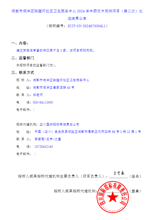 【成都市成华区跳蹬河社区卫生服务中心】四川省成都市成华区跳蹬河社区卫生服务中心2024年中药饮片采购项目(第二次)比选结果公告