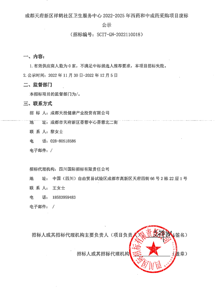 【成都天府新区祥鹤社区卫生服务中心】四川省成都天府新区祥鹤社区卫生服务中心2022-2025年西药和中成药采购项目废标公示