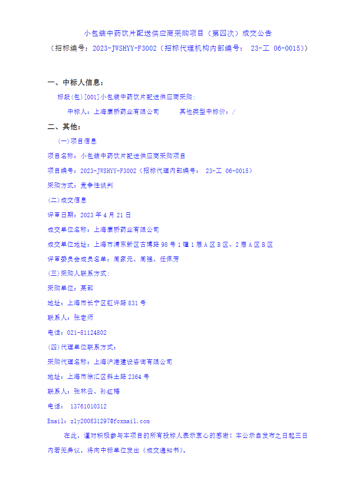 【中国人民武装警察部队上海市总队医院】上海市长宁区中国人民武装警察部队上海市总队医院小包装中药饮片配送供应商采购项目(第四次)成交公告