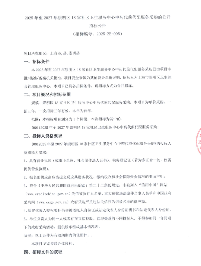 【上海市崇明区卫生综合管理服务中心】上海市2025年至2027年崇明区18家社区卫生服务中心中药代煎代配服务采购的公开招标公告