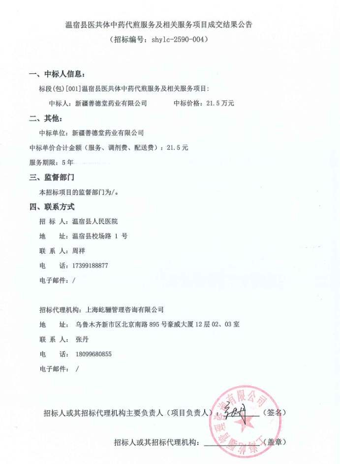 【阿克苏地区温宿县人民医院】新疆维吾尔自治区阿克苏地区温宿县医共体中药代煎服务及相关服务项目成交结果公告