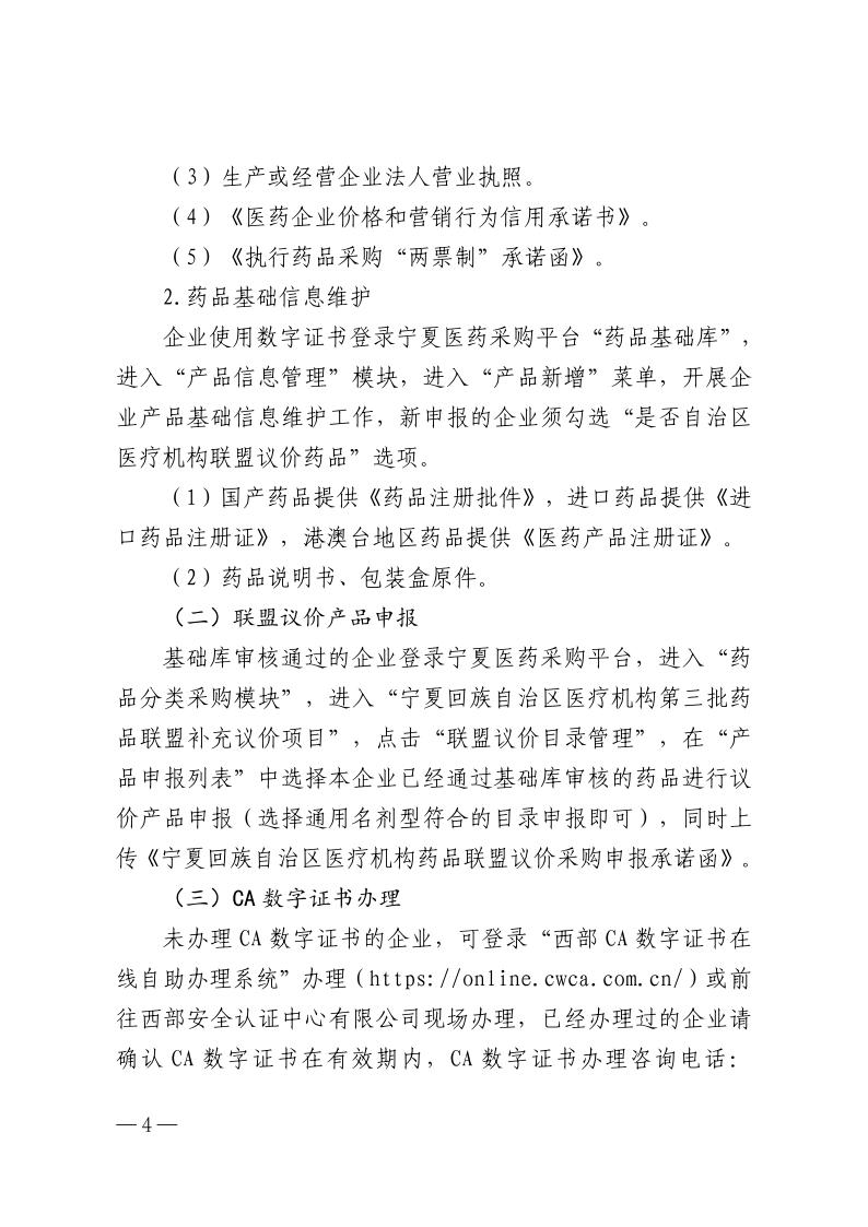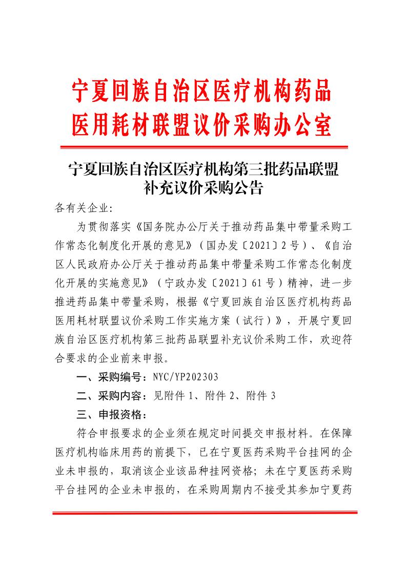 为贯彻落实《国务院办公厅关于推动药品集中带量采购工作常态化制度化开展的意见》(国办发〔2021〕2号)、《自治区人民政府办公厅关于推动药品集中带量采购工作常态化制度化开展的实施意见》(宁政办发〔2021〕61号)精神,进一步推进药品集中带量采购,根据《宁夏回族自治区医疗机构药品医用耗材联盟议价采购工作实施方案(试行)》,开展宁夏回族自治区医疗机构第三批药品联盟补充议价采购工作,欢迎符合要求的企业前来申报。