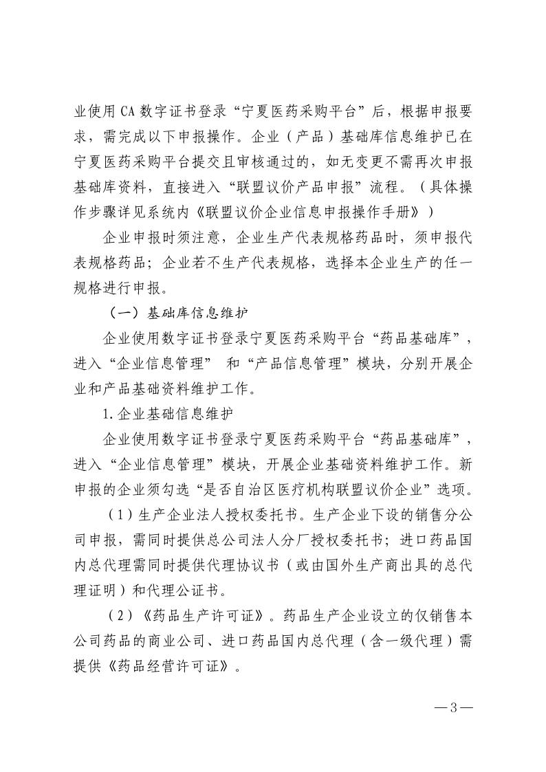 企业信息申报工作在宁夏医药采购平台开展,网址:(https://nxyp.nxggzyjy.org/std/login.html),各申报企业使用CA数字证书登录“宁夏医药采购平台”后,根据申报要求,需完成以下申报操作。企业(产品)基础库信息维护已在宁夏医药采购平台提交且审核通过的,如无变更不需再次申报基础库资料,直接进入“联盟议价产品申报”流程。(具体操作步骤详见系统内《联盟议价企业信息申报操作手册》)企业申报时须注意,企业生产代表规格药品时,须申报代表规格药品;企业若不生产代表规格,选择本企业生产的任一规格进行申报。