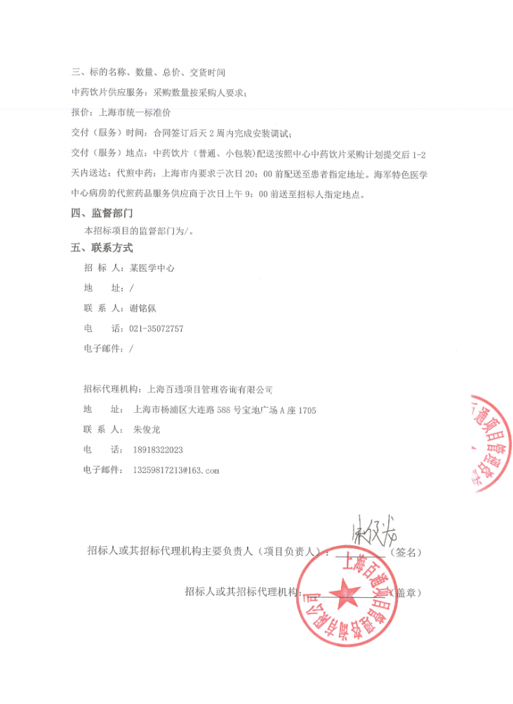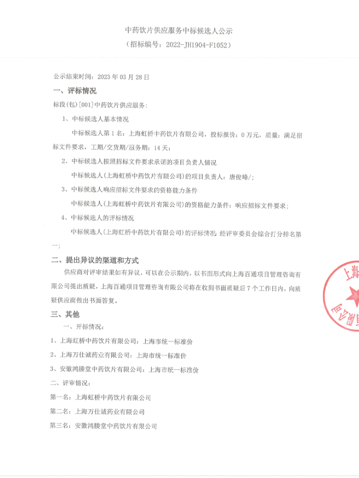 【上海市某医学中心】上海市某医学中心中药饮片供应服务中标候选人公示