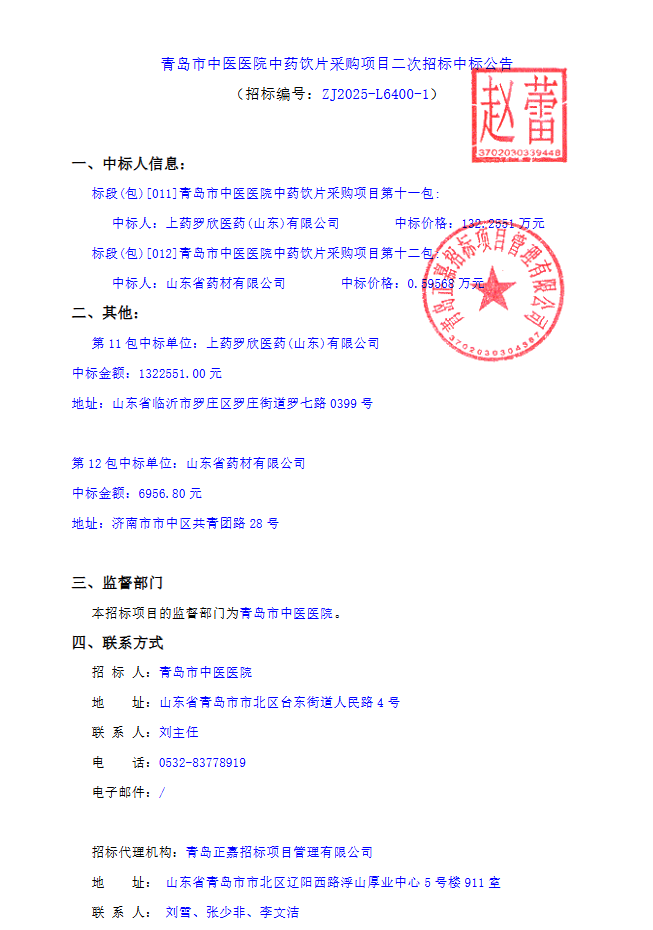 【青岛市中医医院】山东省青岛市中医医院中药饮片采购项目二次招标中标公告