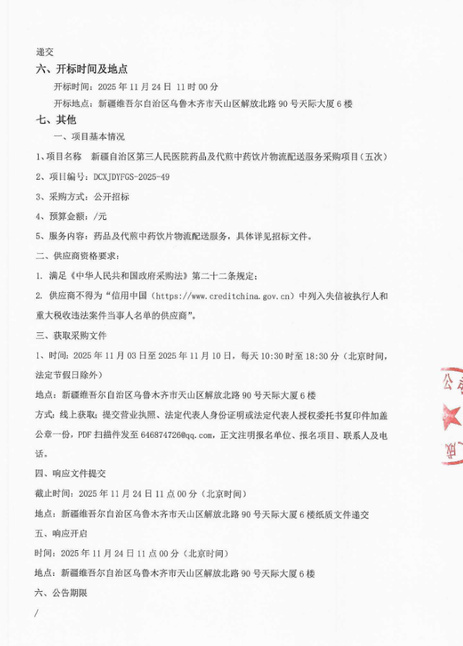 【新疆自治区第三人民医院】新疆自治区第三人民医院药品及代煎中药饮片物流配送服务采购项目(五次)公开招标公告