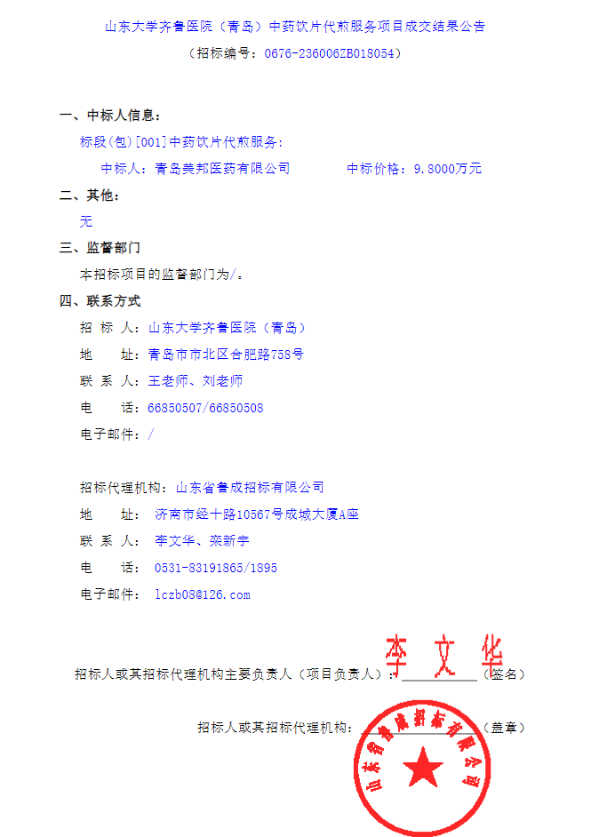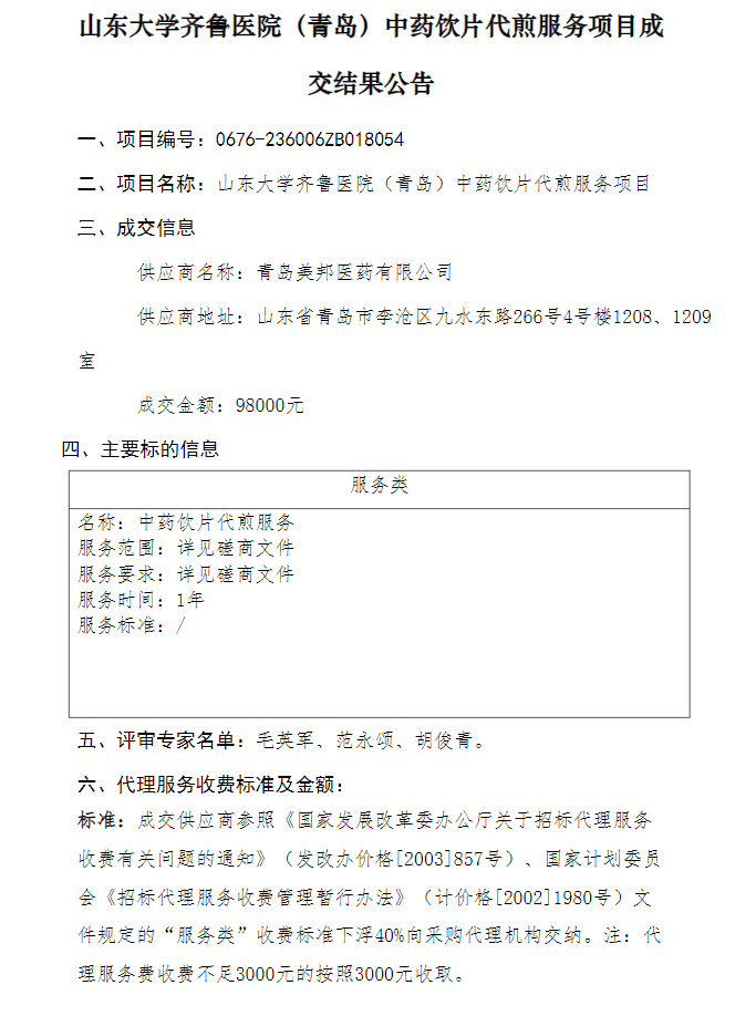 【山东大学齐鲁医院】山东大学齐鲁医院(青岛)中药饮片代煎服务项目成交结果公告