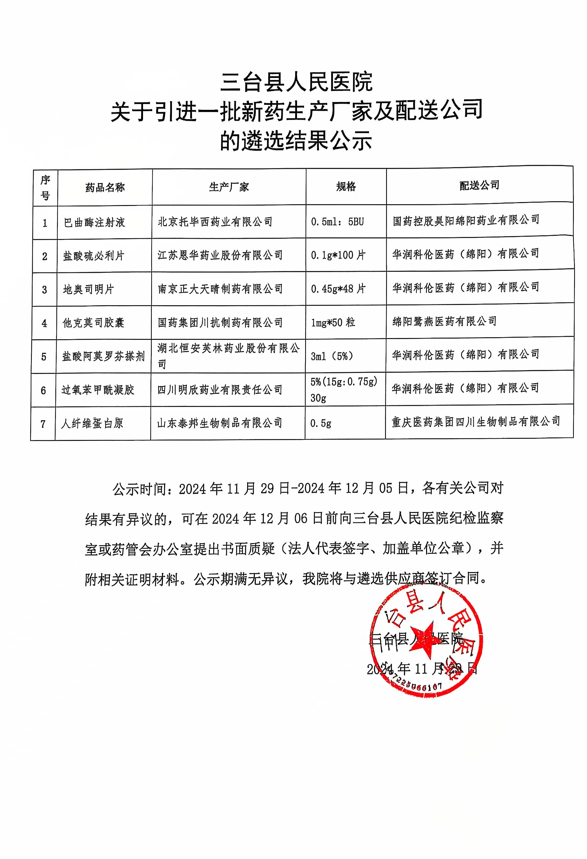 【绵阳市三台县人民医院】四川省绵阳市三台县人民医院关于引进一批新药生产厂家及配送公司遴选结果公示
