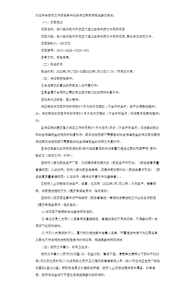 【徐州经济技术开发区大庙卫生院】江苏省徐州经济技术开发区大庙卫生院中药饮片采购项目招标公告